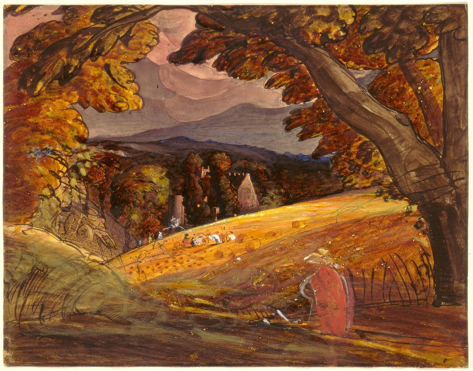 Samuel Palmer Harvesters by Firelight, 1830 pen and black ink with watercolor and gouache on wove paper overall: 28.7 x 36.7 cm (11 5/16 x 14 7/16 in.)